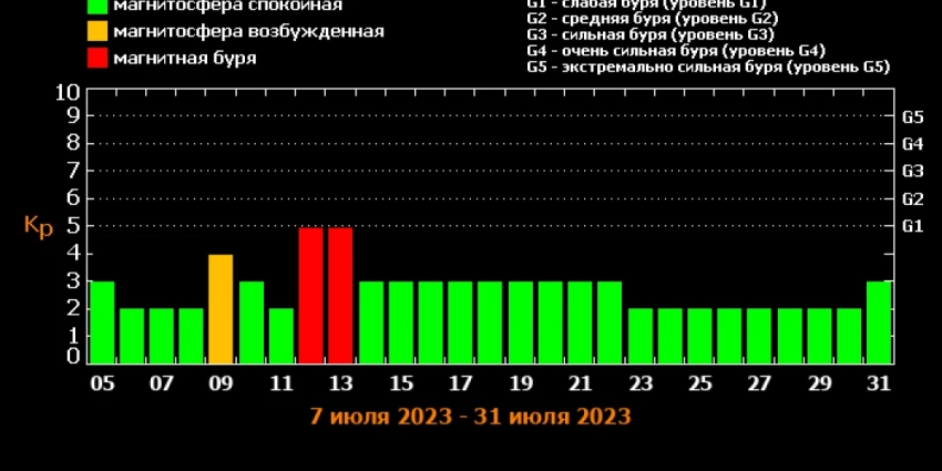В остальные дни июля геомагнитная обстановка будет спокойной — от 2 до 3 баллов, что находится в пределах нормы.