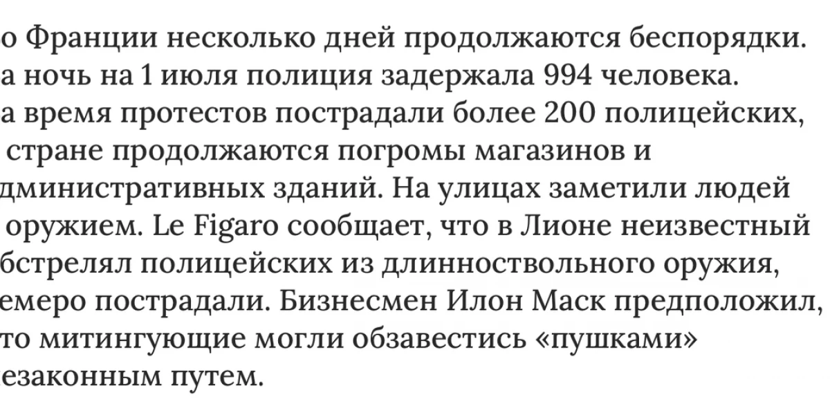 Например, во Франции в эти дни проходят масштабные беспорядки и вооруженные бунты с поджогами автомобилей и разграблением, — прошу прощения, никак не могу выучить современный западный язык двоемыслия, — лутингом всех попадающихся по пути протестующих магазинов. Захватываются оружейные магазины и наносится ущерб городскому и частному имуществу. Идея «великой французской революции» опошлилась до состояния примитивных грабежей.