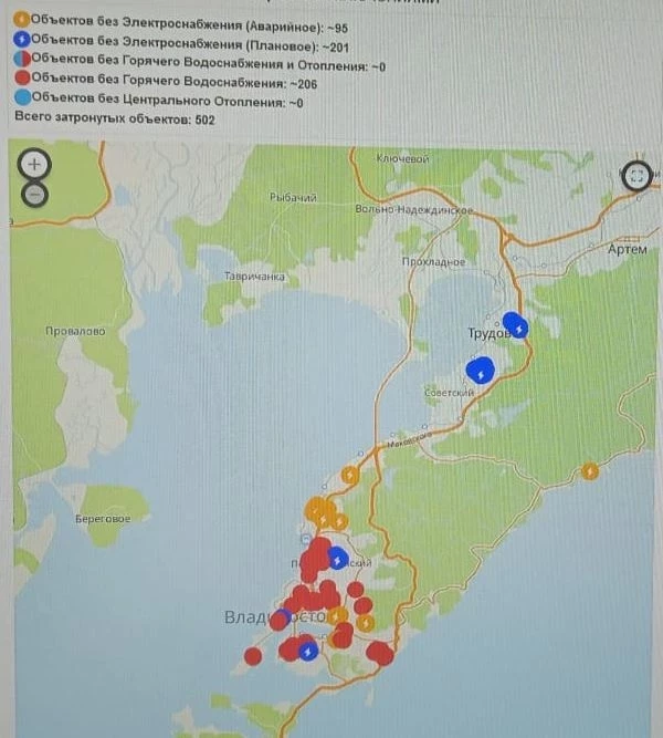 Массовые отключения электроэнергии во Владивостоке. Карта