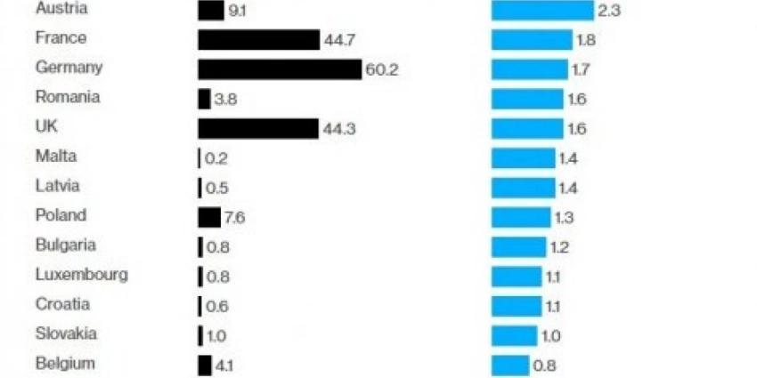 Финансирование, выделяемое европейскими странами (чёрным цветом — общие значения, голубым — процент от ВВП).
