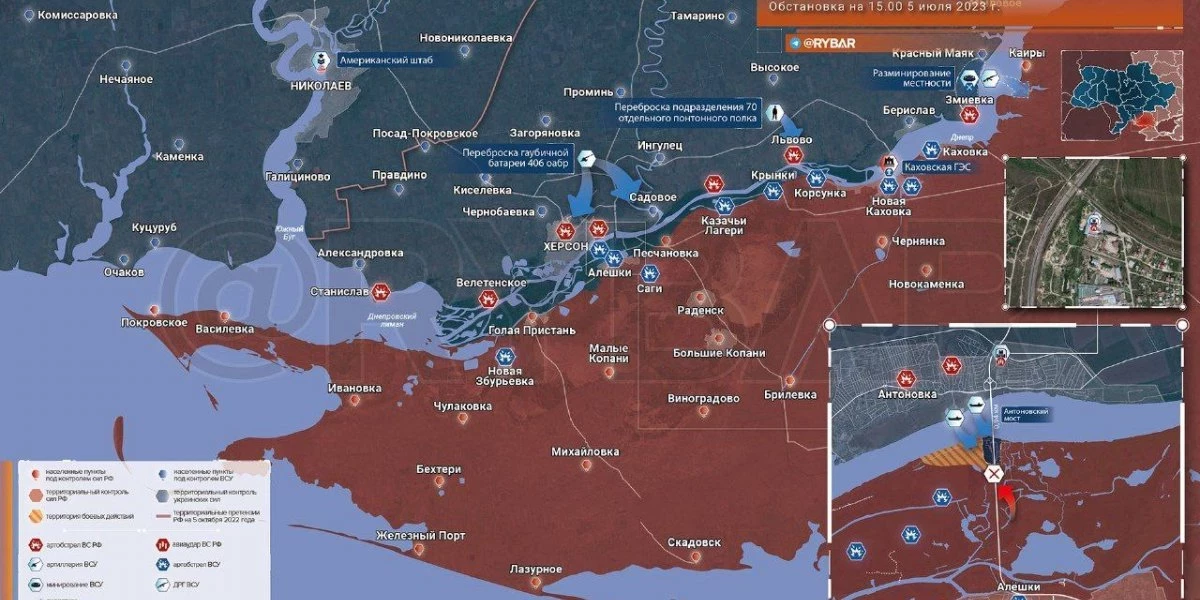 Несмотря на удар ВКС России по мосту и заявления о зачистке плацдарма, противник вновь перебросил под Антоновский мост отряды закрепления. Вчера в ночь две группы были переброшены из Антоновки на двух катерах. Сейчас украинские формирования удерживают позиции под мостом и у гостиницы неподалеку. Российские бойцы попытались отбить территории, однако подразделение ВС РФ попало под шквальный огонь артиллерии с противоположного берега и отошло на исходную.
