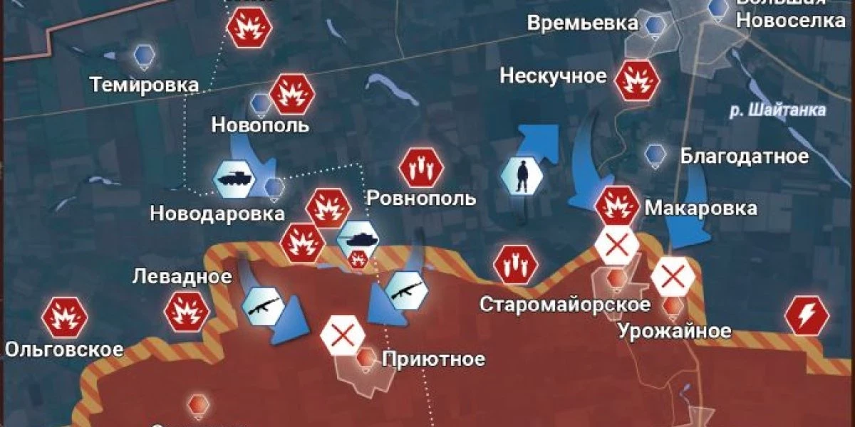 Южнодонецкое направление. Времьевкий участок. Боевики киевского режима продолжают атаки на позиции ВС РФ. Идут ожесточённые бои за лесопосадки к западу от Старомайорского, а также в районе самого населенного пункта и Урожайного. ВКС России наносят удары по скоплениям сил противника, уничтожая вражескую технику и живую силу и, собственно, немного облегчая задачу обороняющихся.