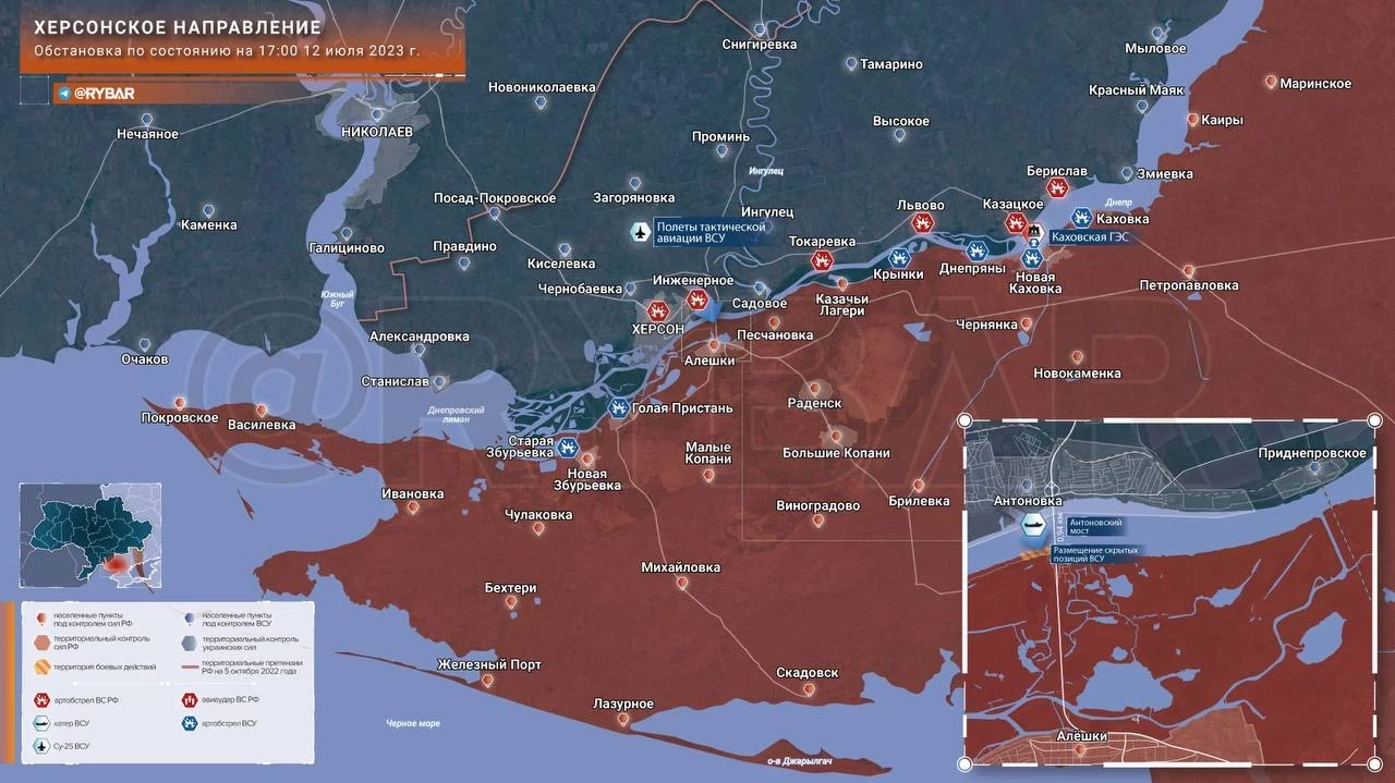 Карта боевых действий: Херсонское направление обстановка к исходу 12 июля 2023 года
