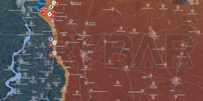 - Украинские передовые разведгруппы ведут поиск позиций ВС РФ и наводят артиллерию ВСУ на рубеже Синьковка — Ольшана, Орлянка — Котляровка — Кисловка, Николаевка и Стельмаховка.