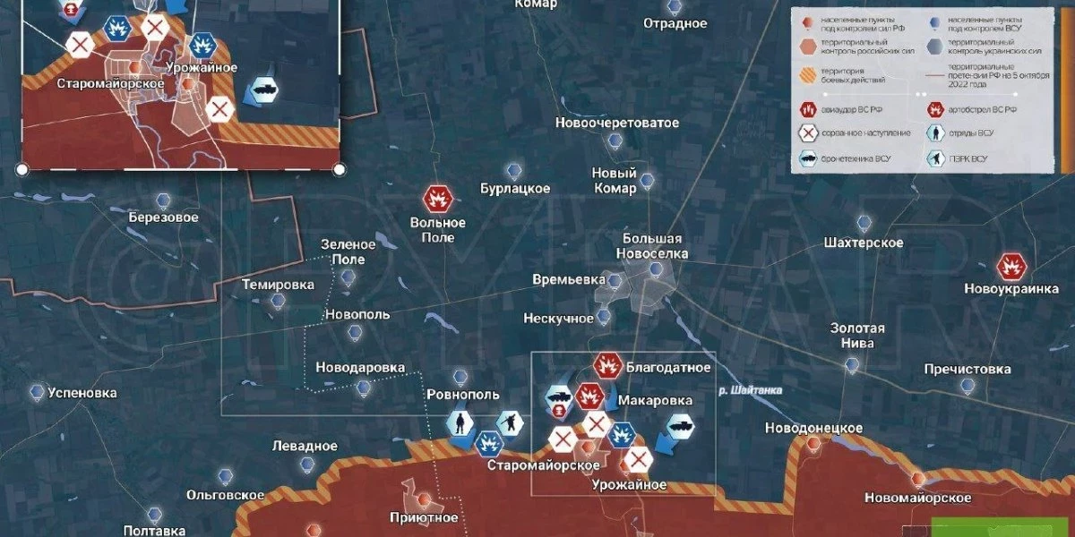 После того как подразделения противника смогли закрепиться у Балки Грушевой, внимание ВСУ вновь переместилось на рубеж Старомайорское — Урожайное.
