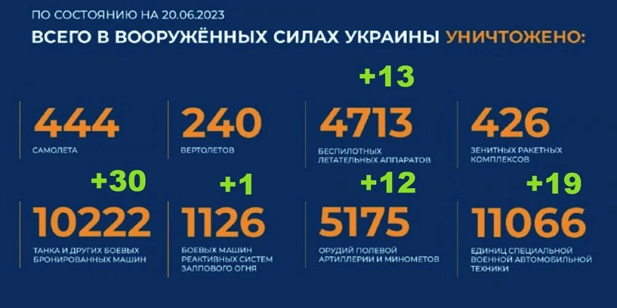 Потери Украины на сегодня 20.06.2023 Всего с начала проведения специальной военной операции уничтожено: 444 самолета, 240 вертолетов, 4713 беспилотных летательных аппаратов, 426 зенитных ракетных комплексов, 10222 танка и других боевых бронированных машин, 1126 боевых машин реактивных систем залпового огня, 5175 орудий полевой артиллерии и минометов, а также 11066 единиц специальной военной автомобильной техники.