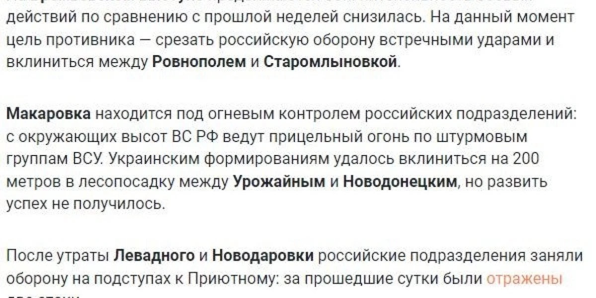 Подчеркивается, что военнослужащие ВС России и бойцы оперативно-боевого тактического формирования ДНР «Каскад» отбивают одну атаку за другой близ сел Приютное и Ровнополь. Там неприятель добился небольшого продвижения.