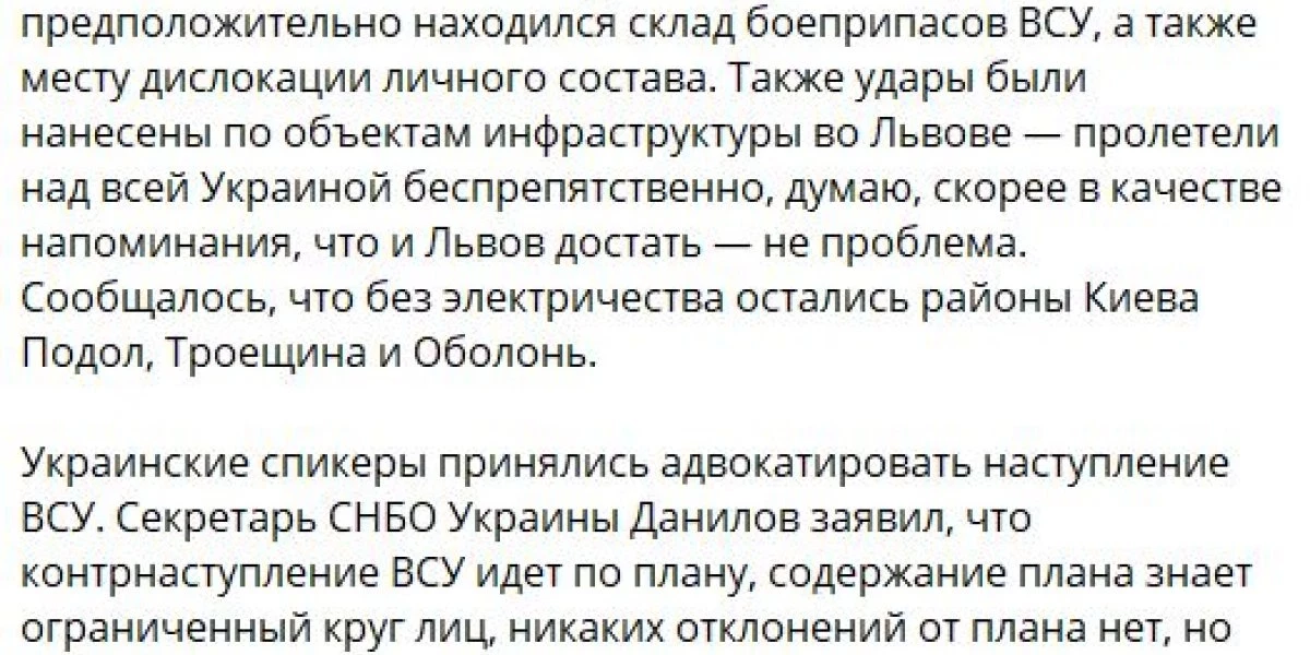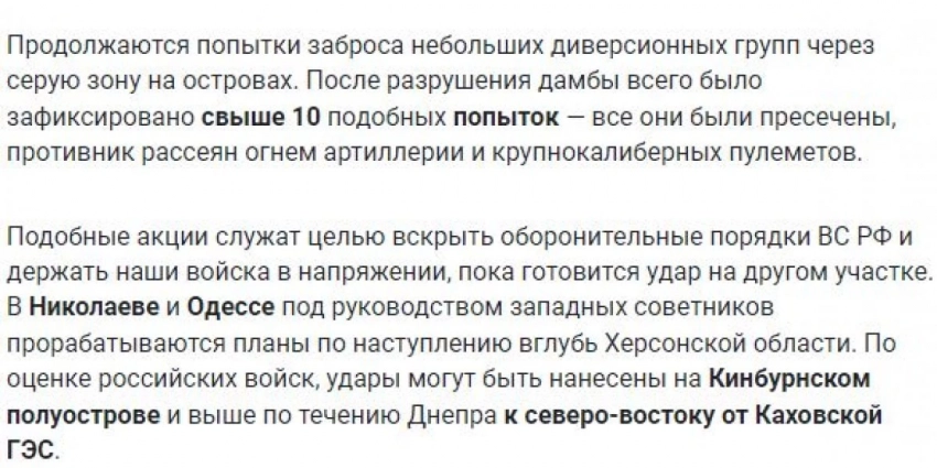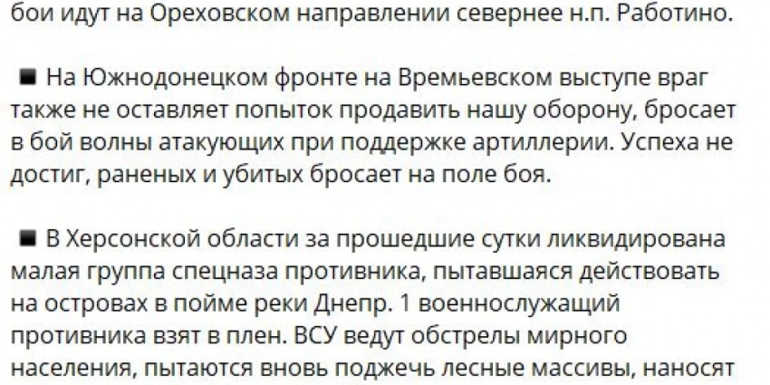 «Украинские войска продолжают предпринимать попытки наступательных действий на Южно-Донецком, Запорожском и Донецком направлениях. При этом киевский режим задействует большое количество западных вооружений и элитные соединения, личный состав которых обучался специалистами НАТО.