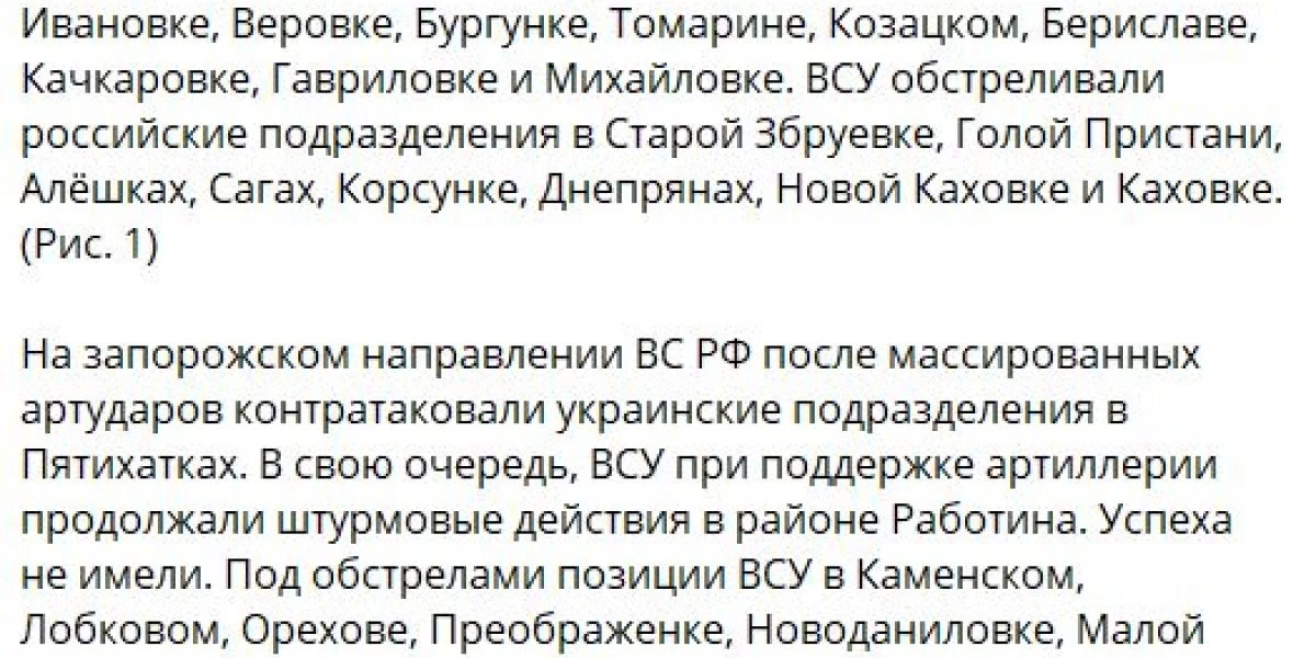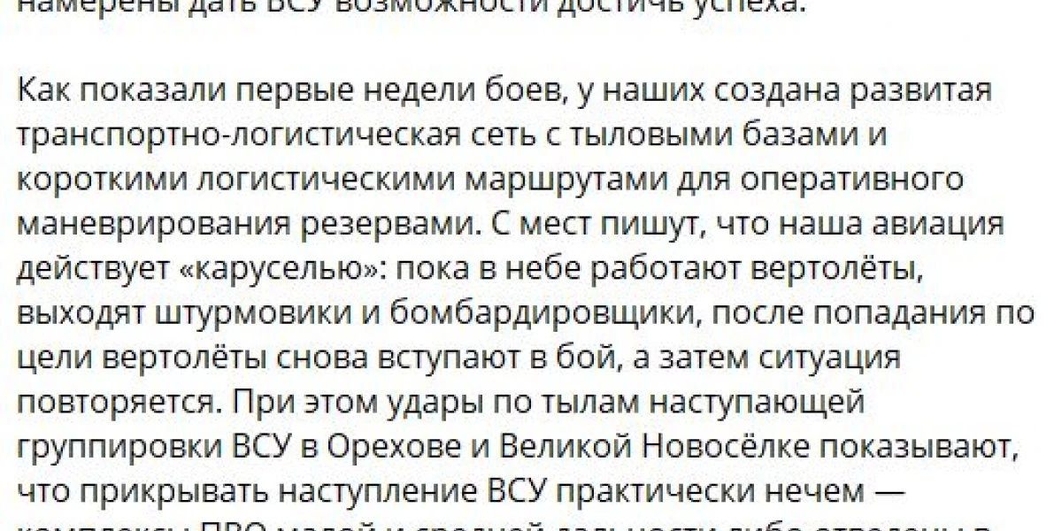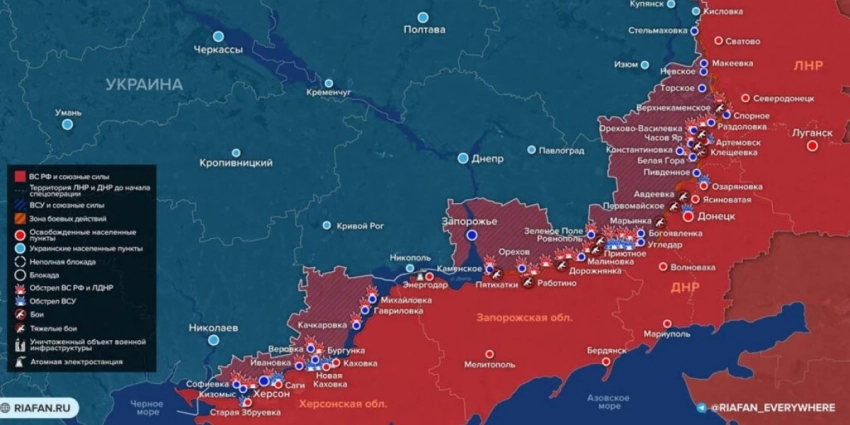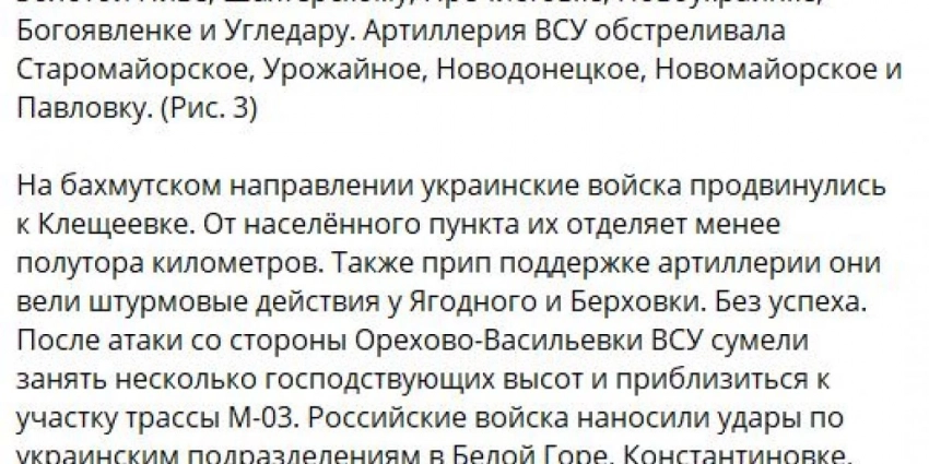 В результате авиа- и артударов, а также боев ВСУ за сутки потеряли здесь до 140 человек, 5 броневиков, 4 автомобиля, орудия М777, Д-20, самоходку «Акация», реактивную систему «Град», а также радиолокационную станцию контрбатарейной борьбы «Зоопарк».