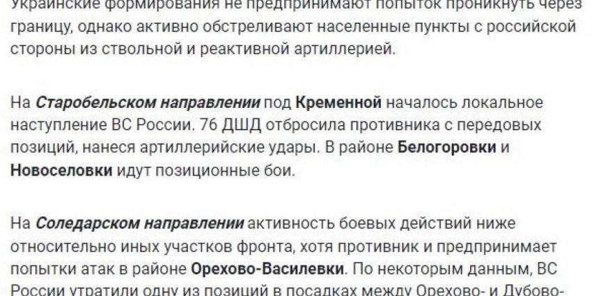- А у нас получается лучше. Прошла даже информация о нашем контрнаступлении на сватово-кременном направлении – пока этого нет, но наша активность присутствует. Противник подбрасывает резервы, пытаясь выбить нас с позиций. Здесь работает наша 76-я воздушно-десантная дивизия.