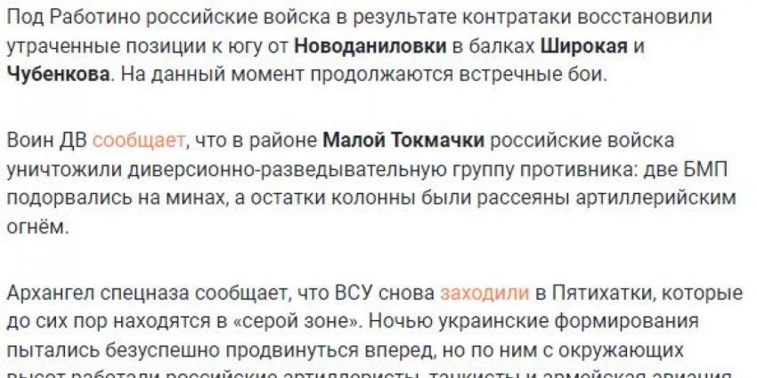 На Запорожском направлении наши войска продолжают сдерживать наступление ВСУ