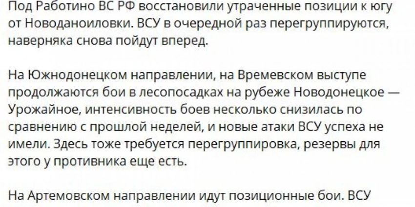 Запорожское направление: не прекращаются бои за Пятихатки, пока в нашу пользу, к тому же немного пополнился обменный фонд. Тем временем ВСУ продолжают концентрировать силы на Ореховском участке. Также российские бойцы вернули позиции в районе Работино. На Времьевском выступе идут бои в окрестностях Урожайного.