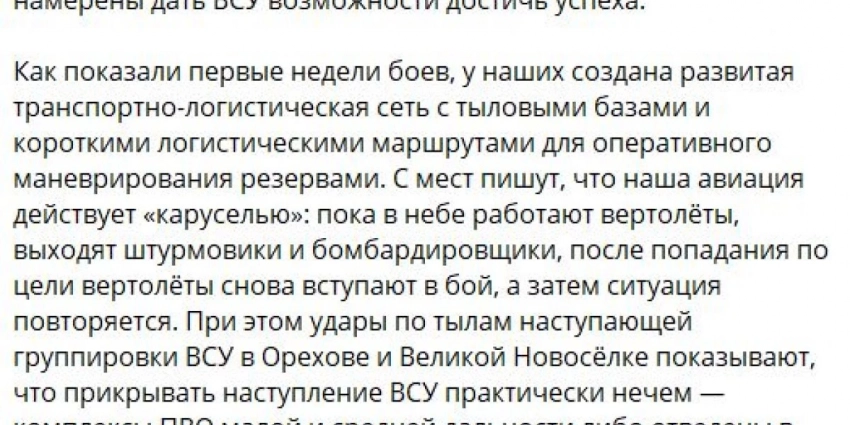 В частности Рейснер указал, что российские боевые вертолеты атакуют колонны бронетехники ВСУ еще до того, как те добираются до места боевого столкновения. Источник