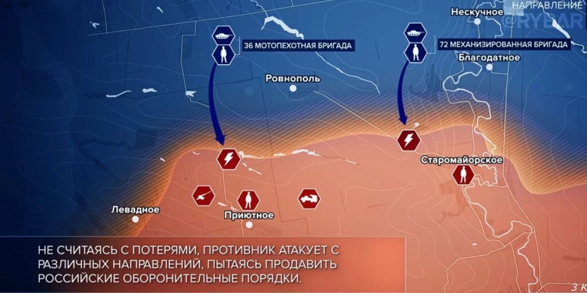 Несколько дней к ряду он атакует на Великоновоселовском направлении, где сумел накануне взять несколько наших позиций на высотах, а ночью он попытался было развить свой успех, атаковав н.п. Старомайорское. Эта атака была отбита, но противник, нащупав слабость (а это стык зоны ответственности 5А и ОБТФ «Каскад»), продолжает свои попытки.