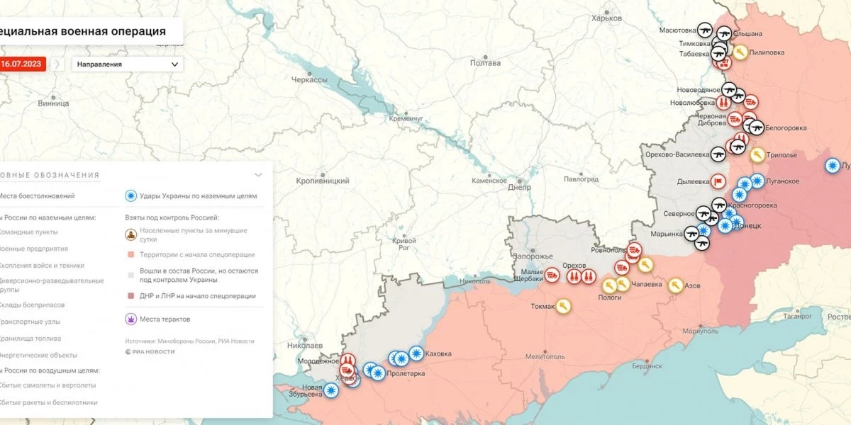 Карта боевых действий на Украине, к утру 17 июля 2023г., от РИА Новости