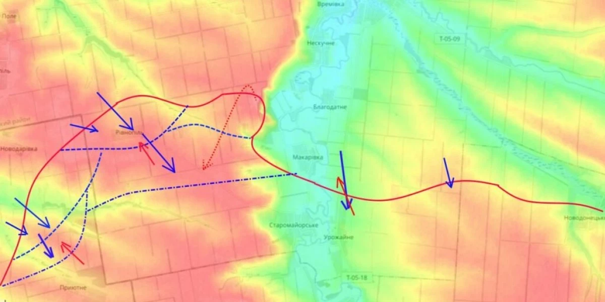Тяжёлые бои на Времевском выступе, враг пытается прорывать фронт у Старомайорского и Приютного. Уже почти 1,5 месяца не прекращаются тяжёлые бои на Времевском выступе, в последние недели враг прорывается к селам Приютное и Старомайорское.