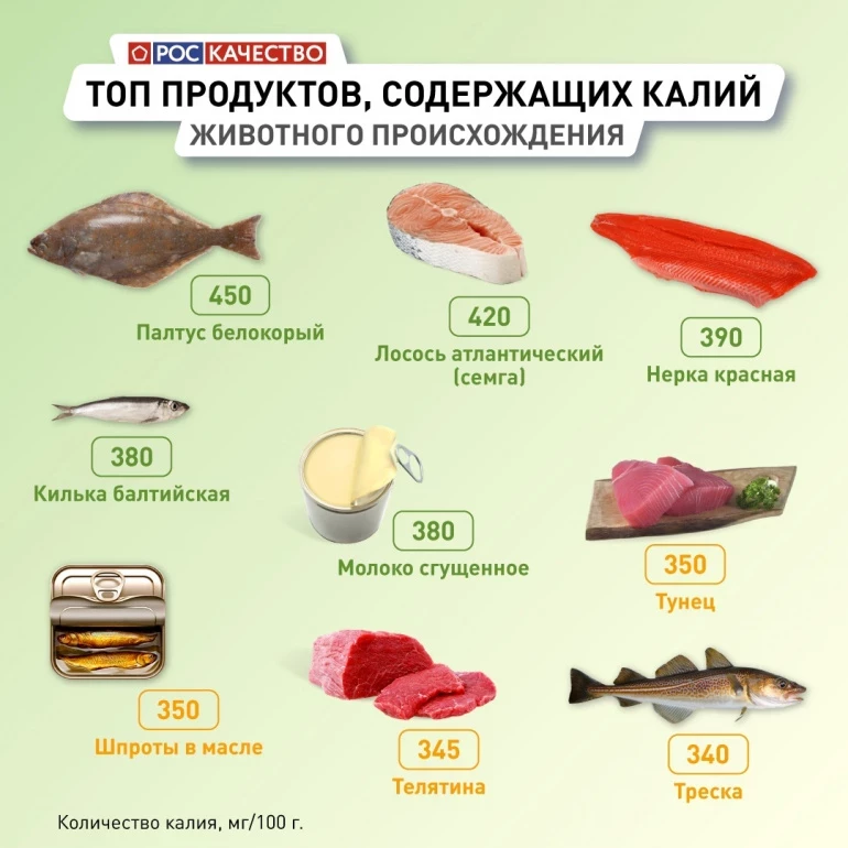 Также калий содержится в телятине, рыбе и — для любителей сладенького — в сгущёнке.