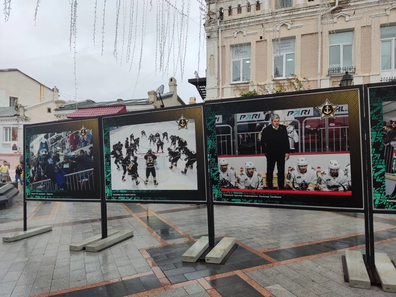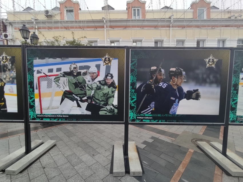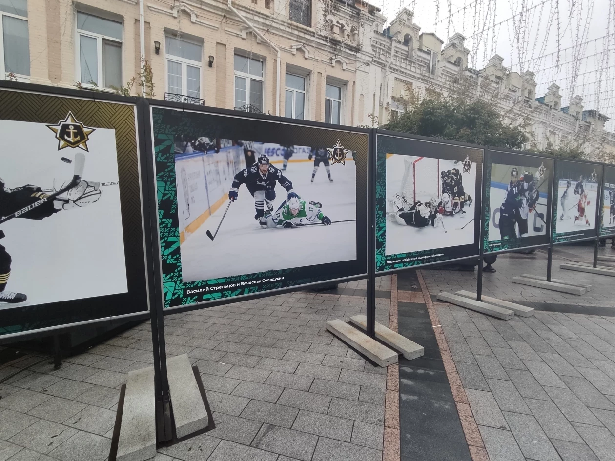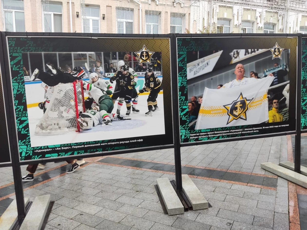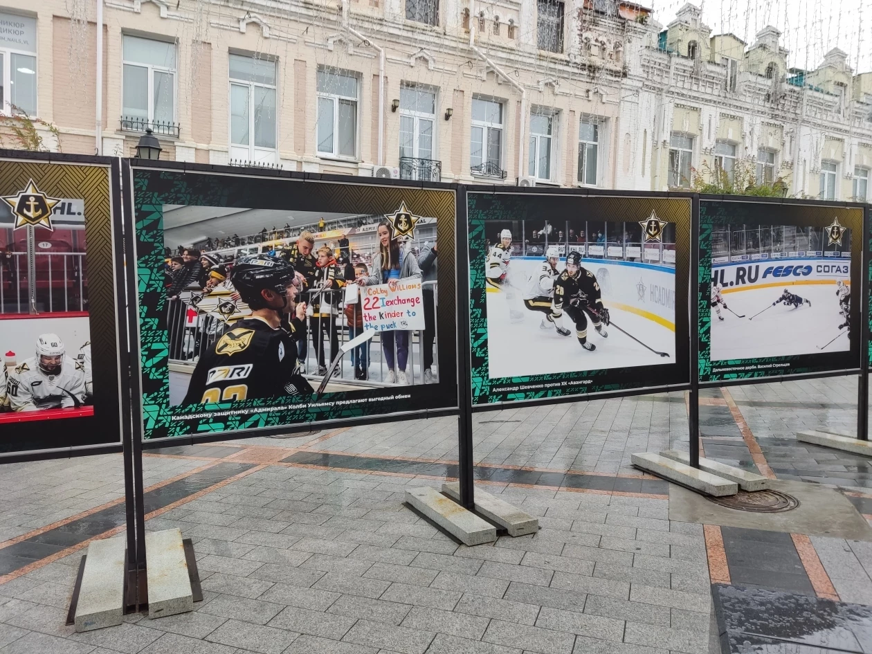 Фотографии уже размещены на улице Адмирала Фокина, однако как пояснили в ХК “Адмирал” выставка откроется через день-два. Из-за непогоды не было возможности установить большие снимки в нужной последовательности и устранить мелкие недочеты.