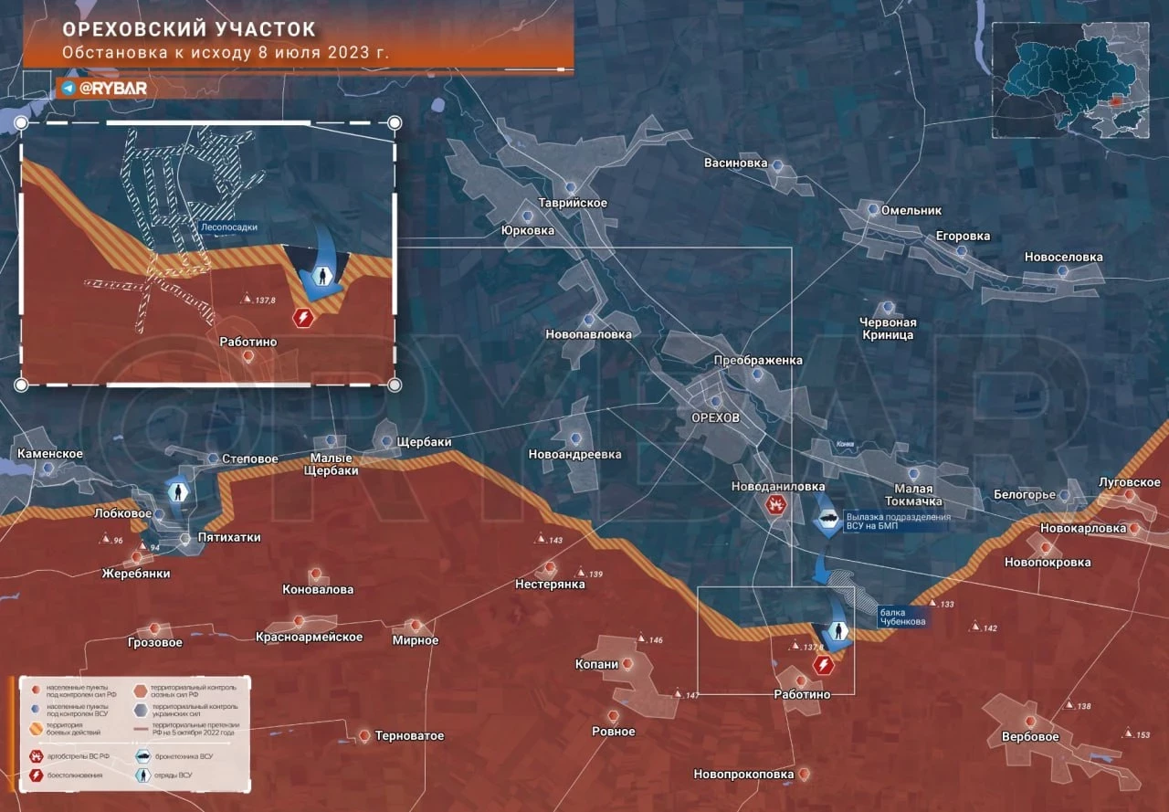 Карта боевых действий: Ореховский участок Обстановка к исходу 8 июля 2023 года