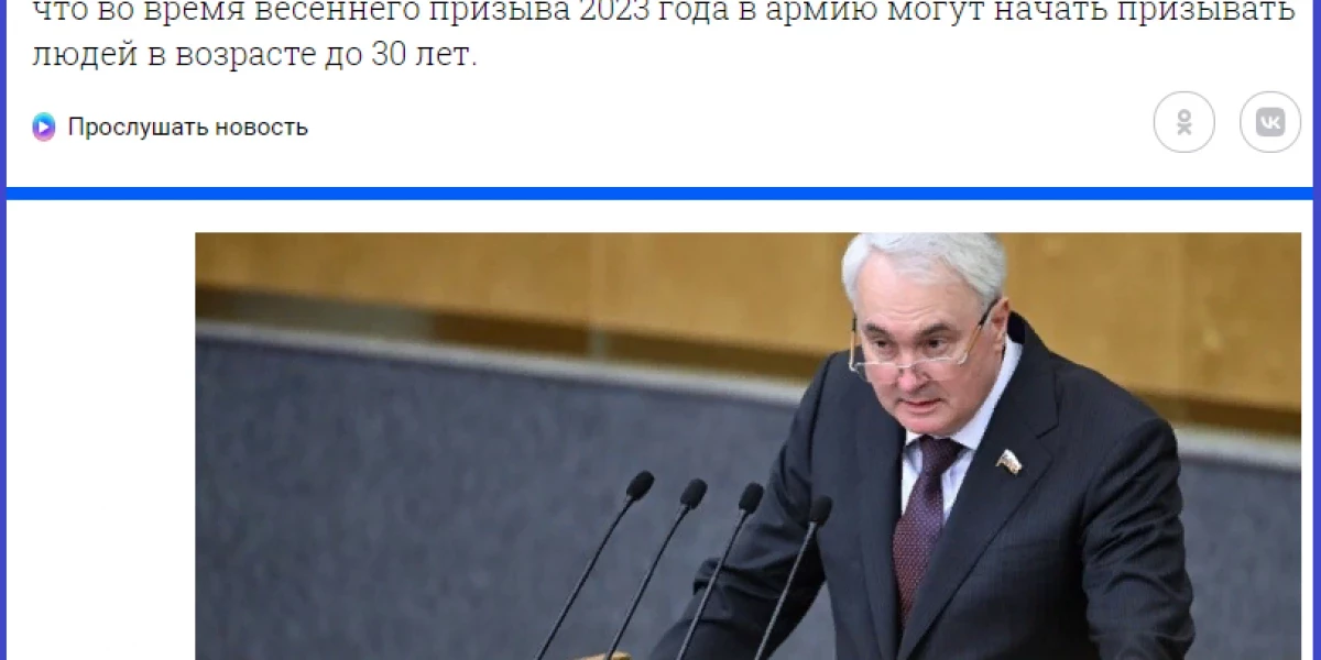 11 января 2023 года. Глава комитета Госдумы по обороне объявил о планах призывать в армию людей до 30 лет уже в грядущий весенний призыв 2023 года. При этом повышение призывного возраста в России займет от года до трех лет, а сам процесс будет происходить поэтапно.