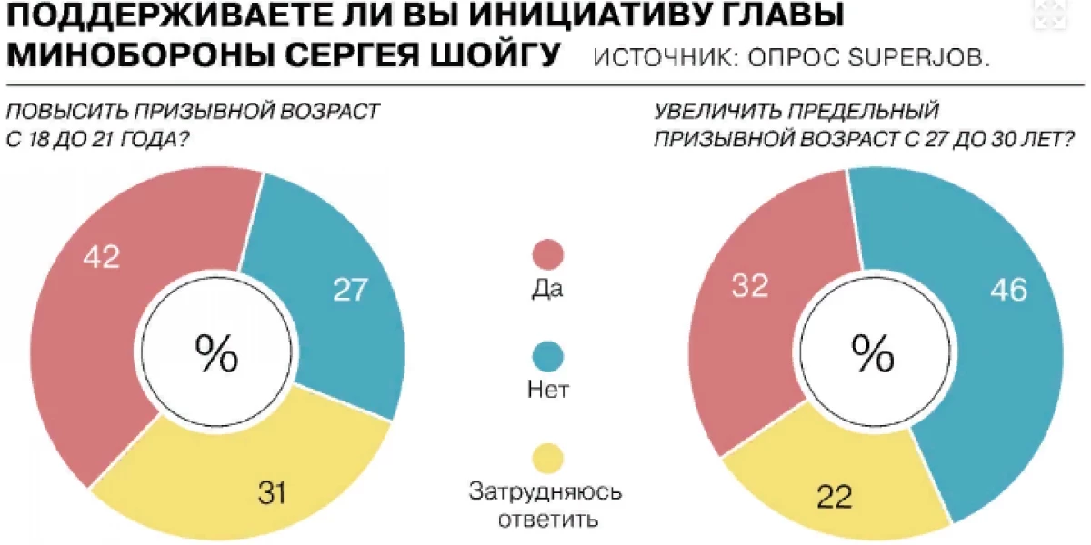 Министр обороны РФ Сергей Шойгу в декабре прошлого года на итоговой коллегии ведомства с участием президента РФ Владимира Путина предложил поэтапно увеличить возраст призыва граждан с 18 лет до 21 года, а предельный возраст повысить до 30 лет. Как отметил в четверг пресс-секретарь главы государства Дмитрий Песков, президент концептуально поддержал идею повышения призывного возраста, но подробности по этой теме нужно узнавать в Минобороны.