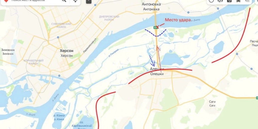 Сегодня утром российские войска нанесли мощный удар ОТРК «Искандер» по остаткам Антоновского моста на левом берегу Днепра, где заняли плацдарм украинские формирования. После удара один из пролетов моста уцелел и ВС РФ продолжают работу по зачистке левого берега от ВСУ.