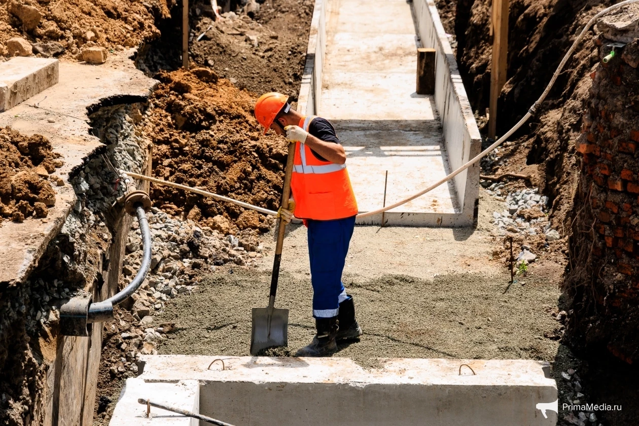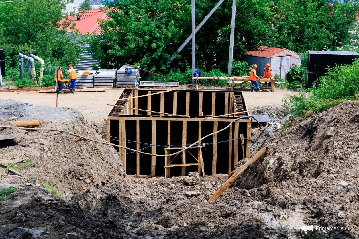 По словам главного инженера ПК Сибэнергомаш Максима Зеленина, на этом объекте сейчас идут земляные работы. Рабочие копают траншеи и укладывают железобетонные конструкции — лотки, в которые уже скоро будут уложены совершенно новые трубы теплоснабжения. Также идет строительство монолитной тепловой распределительной камеры. К слову, в этом году будет построено 268 тепловых камер, из них монолитных — около 40. Монолитные камеры возводят в грунтах, в которых присутствуют агрессивные подземные воды.