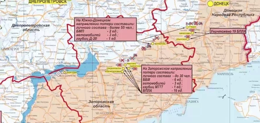 Внушительные потери украинской армии за сутки отмечены на Донецком направлении. Подразделения «Южной» группировки войск поразили целый ряд военных объектов, что привело к гибели порядка 235 украинских военнослужащих. Также были уничтожены две боевые бронированные машины и шесть автомобилей. Активные боевые действия были зафиксированы в районах следующих населенных пунктов: Красное, Васюковка, Раздоловка и Клещеевка Донецкой Народной Республики.