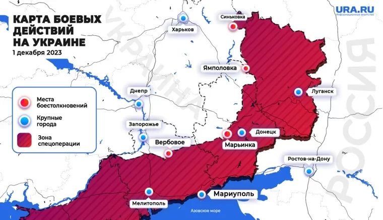 Обновлённая карта боевых действий на Украине по состоянию на 12:00 мск от 01.12.2023