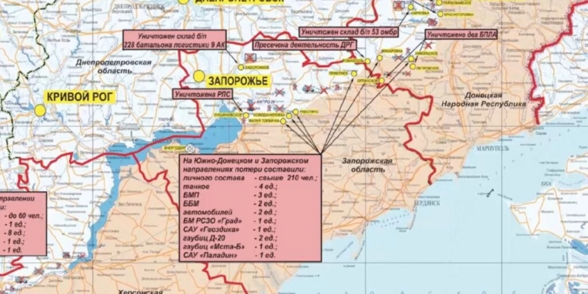 Общие потери противника на данных направлениях составили свыше 210-ти украинских военнослужащих и иностранных наемников, четыре танка, три боевые машины пехоты, две боевые бронированные машины, два пикапа, боевая машина РСЗО «Град», самоходная гаубица «Гвоздика», две гаубицы Д-20 и одна «Мста-Б», а также самоходная артиллерийская установка М109 «Paladin» производства США.