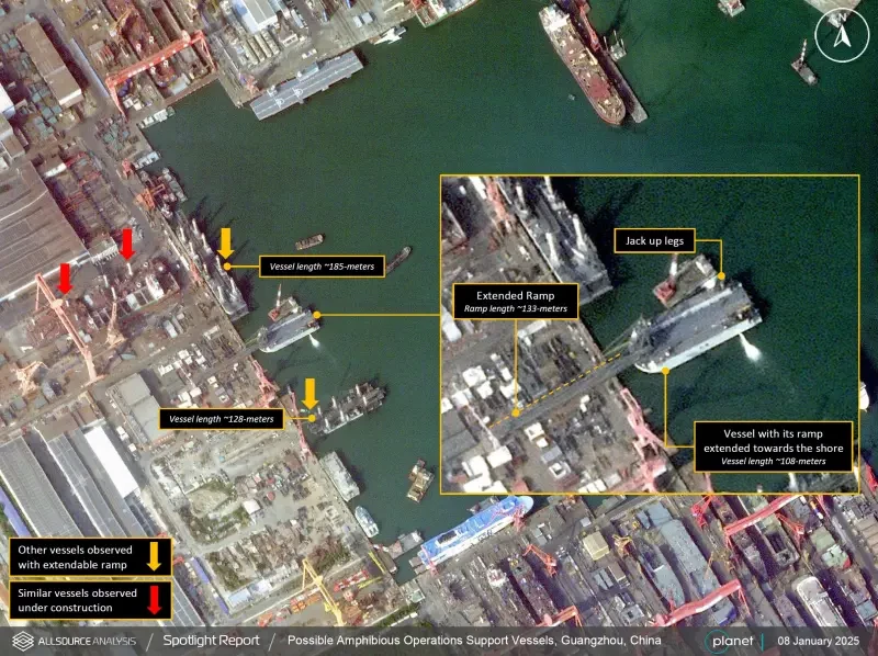 Не совсем понятно, где была сделана последняя серия фотографий, но независимый военно-морской аналитик Х. И. Саттон, пишущий для Naval News, первым на прошлой неделе сообщил о строительстве новых барж на международной верфи Гуанчжоу (GSI) на острове Лунсюэ к юго-востоку от города Гуанчжоу. GSI является дочерней компанией государственной Китайской государственной судостроительной корпорации (CSSC).