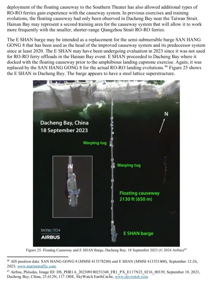 «Возможность переправы через сушу, такая как плавучая дамба, станет критически важной при вторжении на Тайвань, позволяя Народно-освободительной армии Китая обходить повреждённые или разрушенные порты и гавани с помощью независимой, перемещаемой береговой погрузочно-разгрузочной платформы. По крайней мере, до 2030 года резервный гражданский торговый флот НОАК, вероятно, не сможет обеспечить значительные возможности для высадки морского десанта или морскую логистику в суровых или сложных условиях, необходимых для крупномасштабного вторжения на Тайвань через Тайваньский пролив. Тем не менее, если нынешние тенденции в обучении и учениях сохранятся, к середине 2030-х годов НОАК сможет эффективно использовать гражданское морское судоходство в достаточно больших масштабах для поддержки крупной десантной операции».