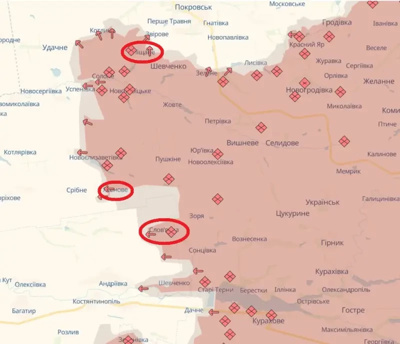 Украинские мониторинговые ресурсы подтверждают успешное продвижение армии России к западу от Покровска. По состоянию на текущий момент российские войска взяли под свой контроль весь участок автомобильной дороги Котлино-Удачное, а также продвигаются в черте этих населённых пунктов.