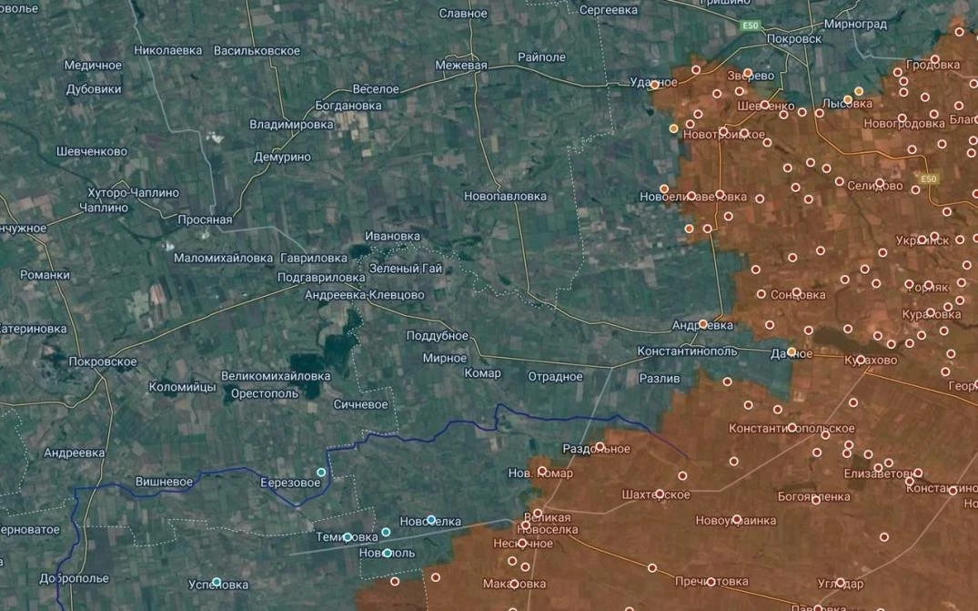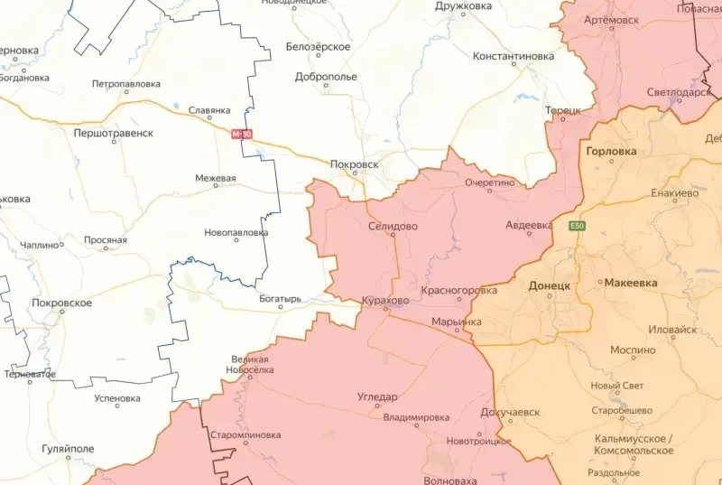 Группировка российских войск, обходящая Покровск с юга на запад, фактически повторяет операцию «Очеретинский цветок». Это следует из карты районов, где сейчас идут боевые действия.
