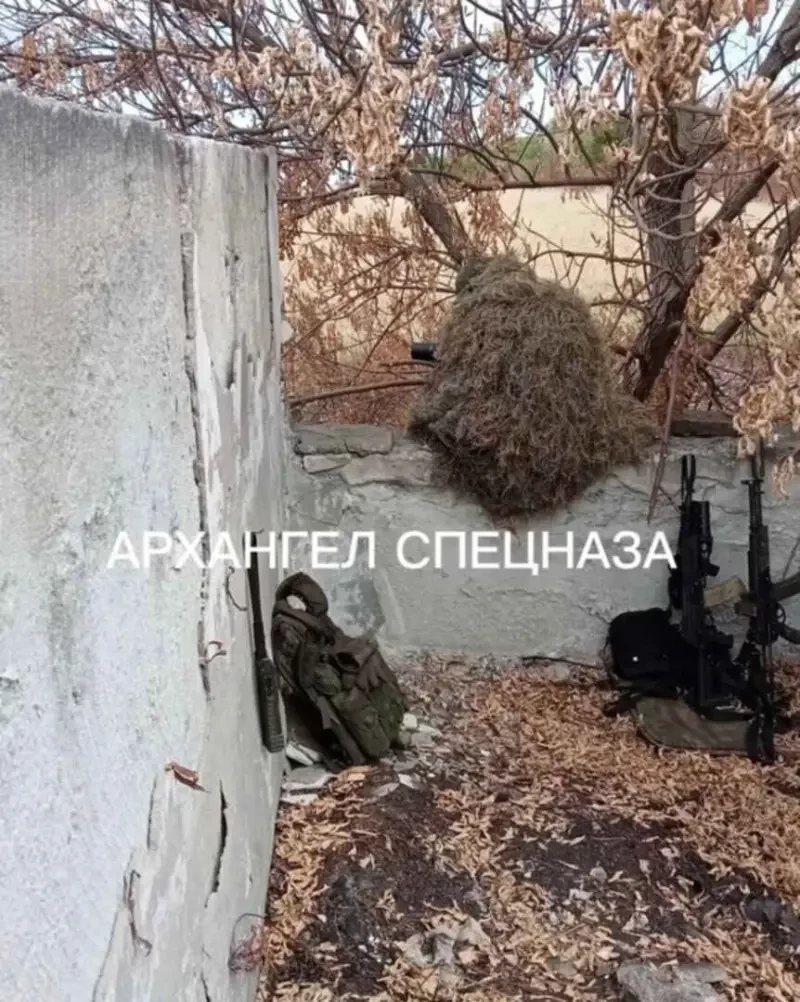 Боец спецназа в маскировочном костюме «Гилли» ведёт наблюдение за противником. У стены за его спиной стоит А-545.