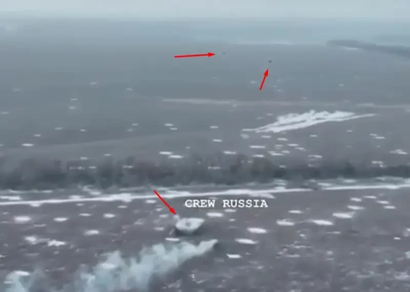 Затем в небе появляются две «Бабы Яги», которые несколько раз осуществляли сброс боеприпасов по российской машине. К счастью, экипаж сумел увернуться от воздушных ударов.