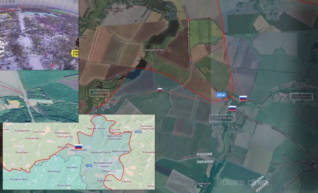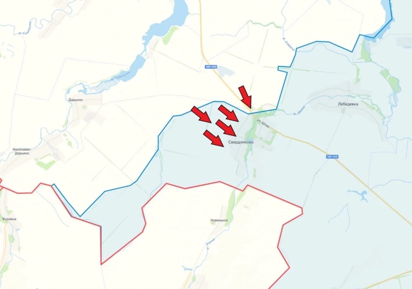 Северо-западнее Суджи наши войска атакуют в районе приграничного села Свердликово. Несмотря на отчаянное сопротивление ВСУ, наши десантники отбивают один опорник за другим, так что большая часть села уже под контролем ВС РФ. Наши войска переправились через реку Локня и пытаются выбить противника полностью из этого села, что в случае успеха будет создавать угрозу трассе снабжения ВСУ Сумы-Суджа. Противник пытается стабилизировать ситуацию на участке фронта, перебрасывает резервы.
