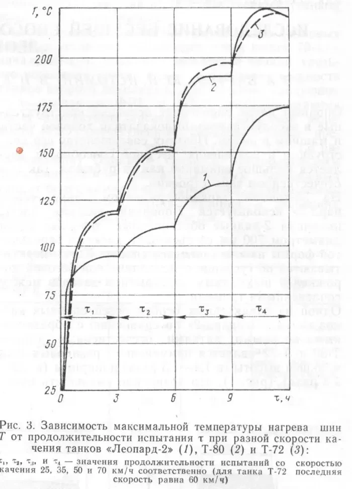 Эксперимент показал, что температура в средней, наиболее нагретой точке поперечного сечения шины танка «Леопард-2» составляет 160-170 °С, что на 25% ниже температуры нагрева шин танков Т-80 и Т-72 при качении по серийным гусеницам со скоростью соответственно 70 и 60 км/ч.