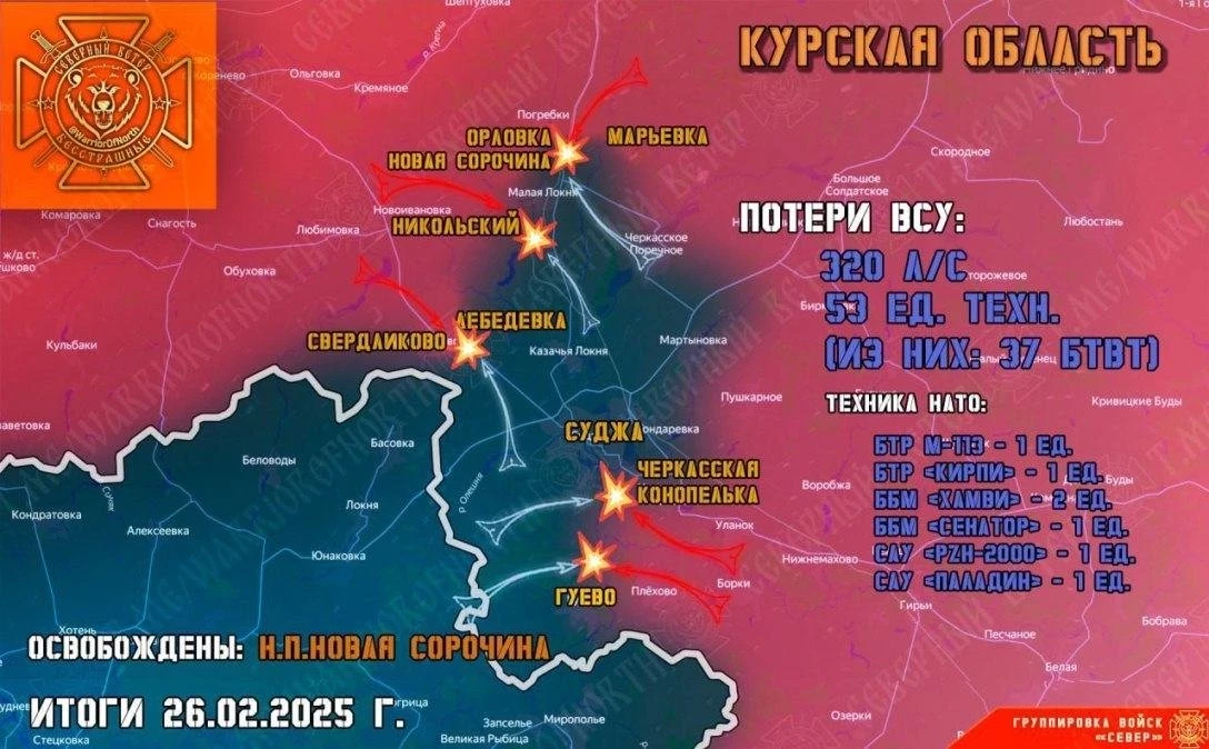 В свою очередь Telegram-канал "Северный ветер" проинформировал о том, что накануне, 26 февраля, группировка войск "Север" продолжила выполнять задачи по освобождению Курской области. Наши Бесстрашные мотострелки, сломив ожесточенное сопротивление противника, освободили деревню Новая Сорочина! Также штурмовые отряды Северян продвинулись и в окрестных лесополосах.