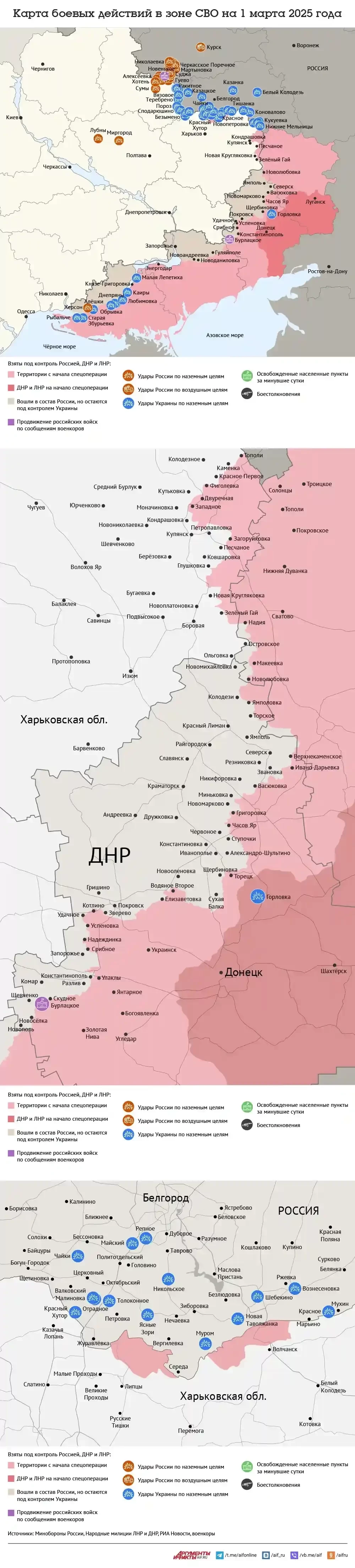 Обновлённая карта боевых действий на Украине по данным на 13:00 мск сегодня, 01.03.2025