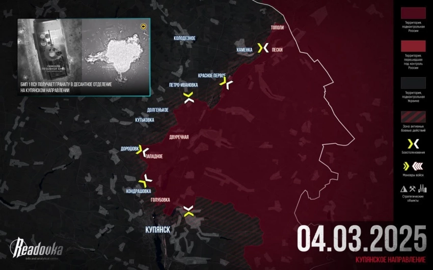 На Купянском направлении ВС РФ штурмуют окраины Кондрашовки и Голубовки. На плацдарме в районе Тополей упорные бои.