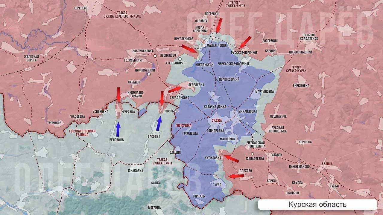 На западном фланге части вооруженных сил России продолжают зачищать лесополосы и продвигаться вдоль госграницы и между Свердликово и Лебедевкой. В Лебедевке продолжаются упорные бои на восточной окраине и в окружающих посадках, сообщает в Telegram-канале Олег Царёв.
