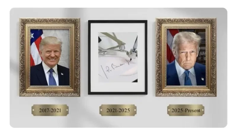 Также Дональд Трамп опубликовал коллаж, на котором в ряд вывешены три портрета президентов США руководивших страной с 2017 года по настоящее время. Под ними указаны годы их правления. На первом и третьем фото присутствует нынешний глава государства, а между ними – фото автоматического устройства, воспроизводящего подпись Байдена.