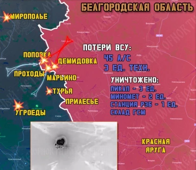 Противник возобновил попытки прорыва через государственную границу в пешем порядке и на квадроциклах. Северяне продолжают перемалывать штурмовые подразделения противника на окраинах приграничных населенных пунктов Демидовка и Поповка. Сообщения о захвате данных приграничных сел врагом являются ложными.