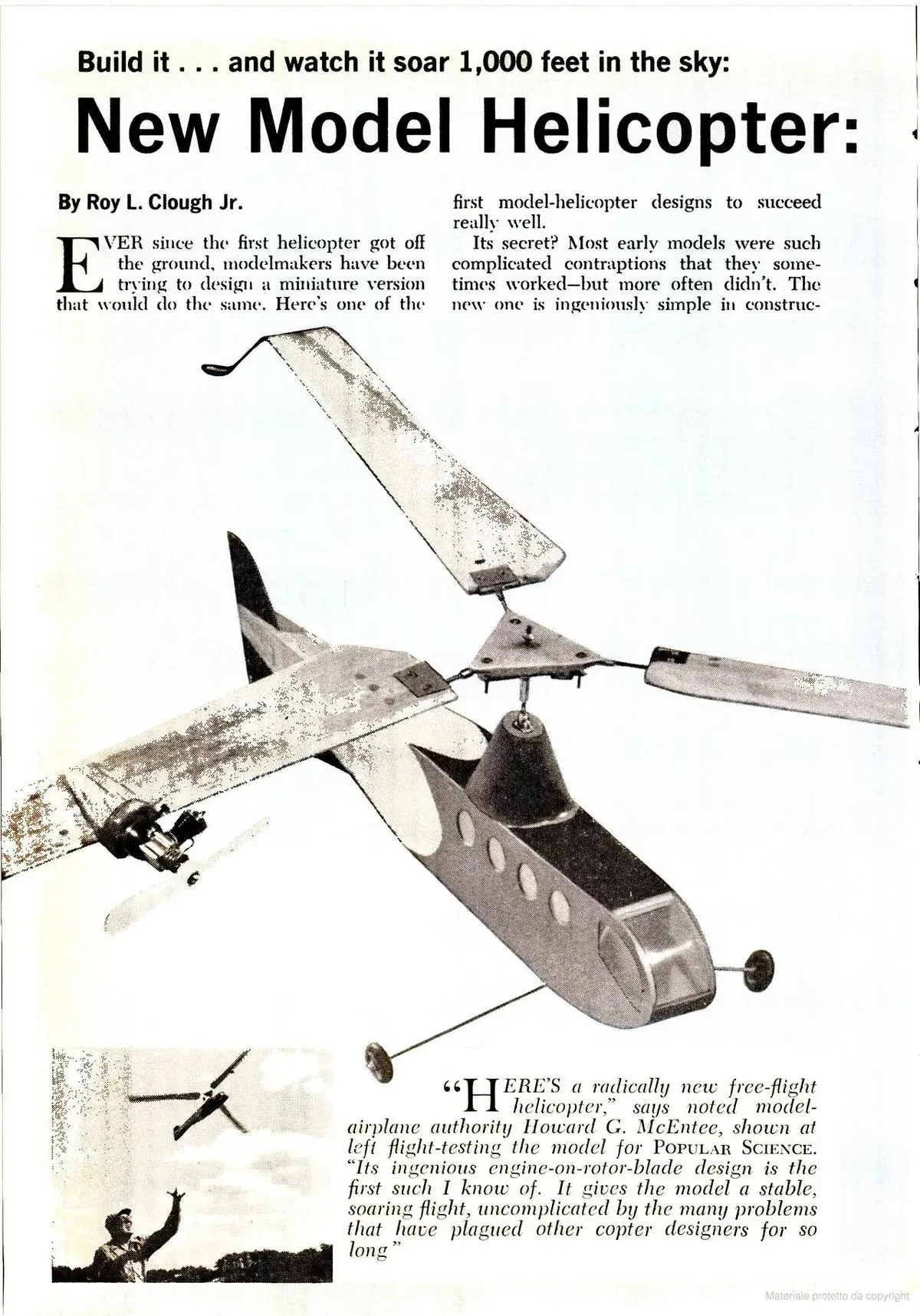А вот очень интересная модель вертолёта. Её воздушный винт раскручивается за счёт двигателя с воздушным винтом на самой его лопасти. Довольно долго модели вертолётов подобного типа были очень популярны среди моделистов, но затем, так же как и однолопастные системы, сошли на нет, не выдержав испытание временем