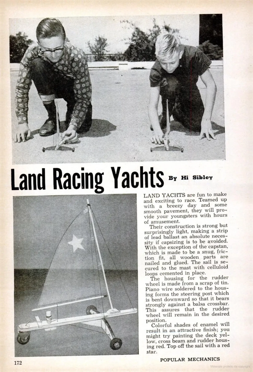 «Сухопутная яхта», сделать которую проще простого. Причём почему-то сделали её со звёздочкой на парусе. Кстати, в своей книге «Из всего, что под руками» мной была описана похожая ледовая яхта с корпусом из… пенала для зубной щётки. Естественно, «пришедшего в негодность». По-иному в 1987 году писать было нельзя
