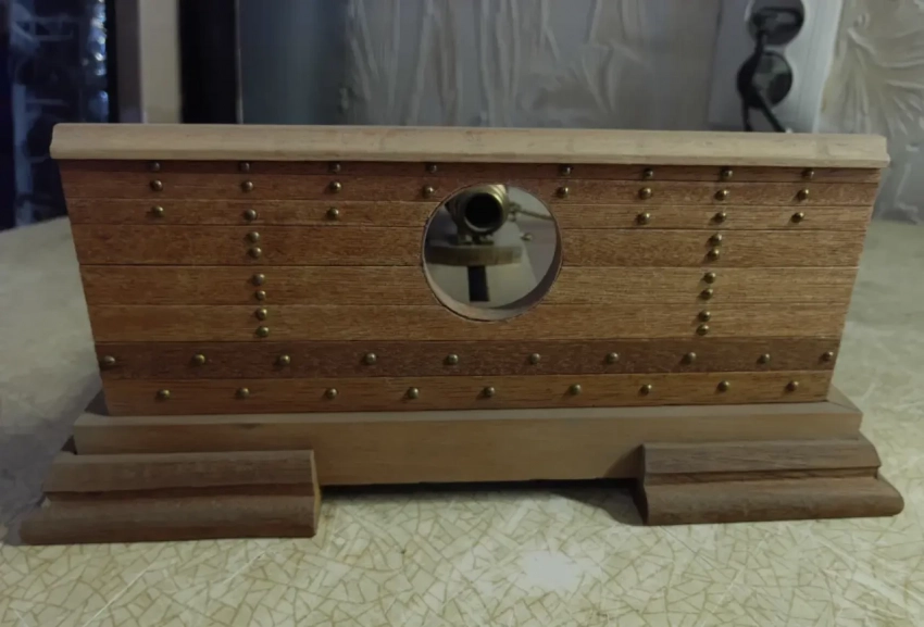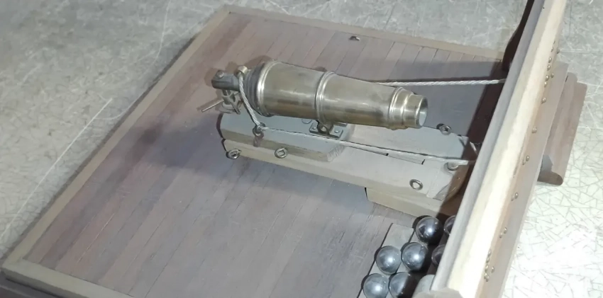 А вот это не просто кусок корабельного борта, а ещё и кусок палубы и корабельная пушка-карронада работы пензенского моделиста Ю. Пивкина, компания «Major Models». Мастерская работа, что и говорить, как и броневагон «Заамурец». Вот только ядра, на мой взгляд, уж очень «блескучие». Надо бы их превратить в «чугунные»…