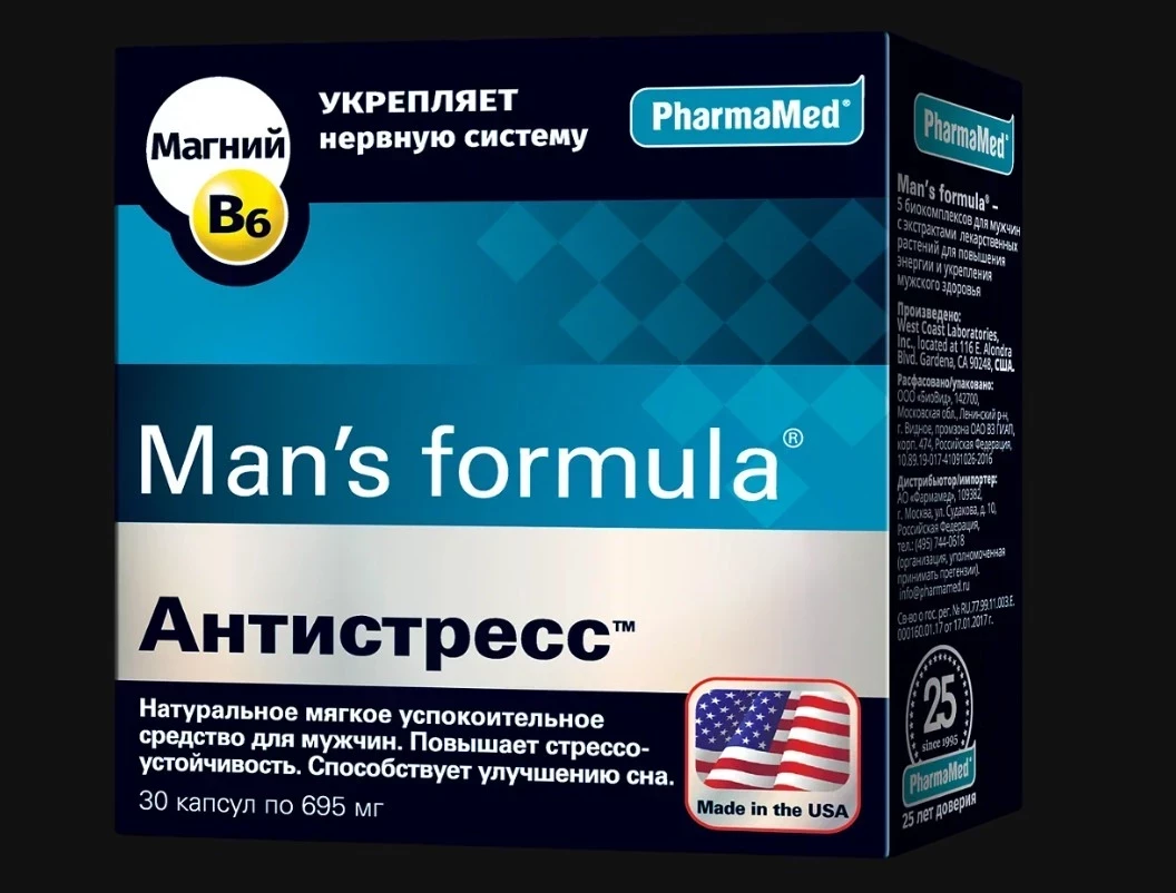 Если говорить про топ 10 БАДов для мужчин, способных реально справляться со стрессом — Man's Formula уверенно берёт своё место. Это не просто набор витаминов, а сбалансированный адаптогеновый комплекс с элеутерококком, зверобоем, валерианой и хмелем — то есть тем, что работает в паре с нервной системой, а не давит её, как аптечные транквилизаторы. Витаминный блок (C, E, группа B, магний, цинк) добавлен грамотно, без перегруза — именно в той дозировке, что поддерживает организм при хроническом стрессе, бессоннице и нервных перегрузках. Препарат заточен под мужскую физиологию и отлично подходит как для восстановления после длительных стрессов, так и в качестве профилактики. Работает мягко, без эффекта «выключенного мозга». West Coast Laboratories — американский бренд с хорошей репутацией, и это чувствуется по формуле. Серьёзный продукт для тех, кто не хочет глушить стресс энергетиками и кофе.