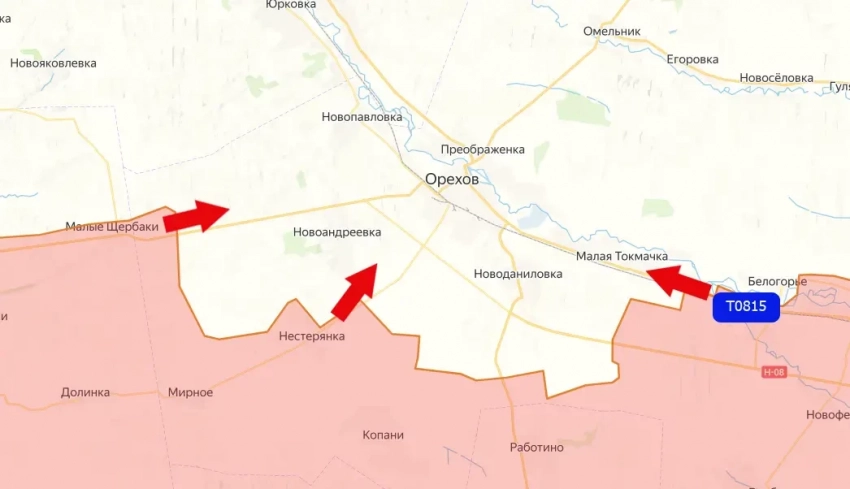 Продвижение к Орехову идёт и с других направлений. На фрагменте карты эти направления помечены: со стороны ранее освобождённых Малых Щербаков, а также со стороны Нестерянки. Чтобы не допустить обвала фронта, под Орехов и в конкретно в Малую Токмачку командование ВСУ перебросило несколько подразделений, включая подразделение операторов фронтовых БПЛА.
