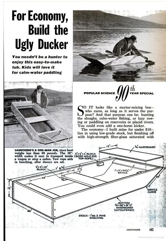 Не брезговали журналы даже и такими простейшими самоделками, как вот эта, например, лодка. Сегодня сделать ее можно буквально за один день, да еще и оснастить ее поворотным электромотором с винтом вместо руля и весел.